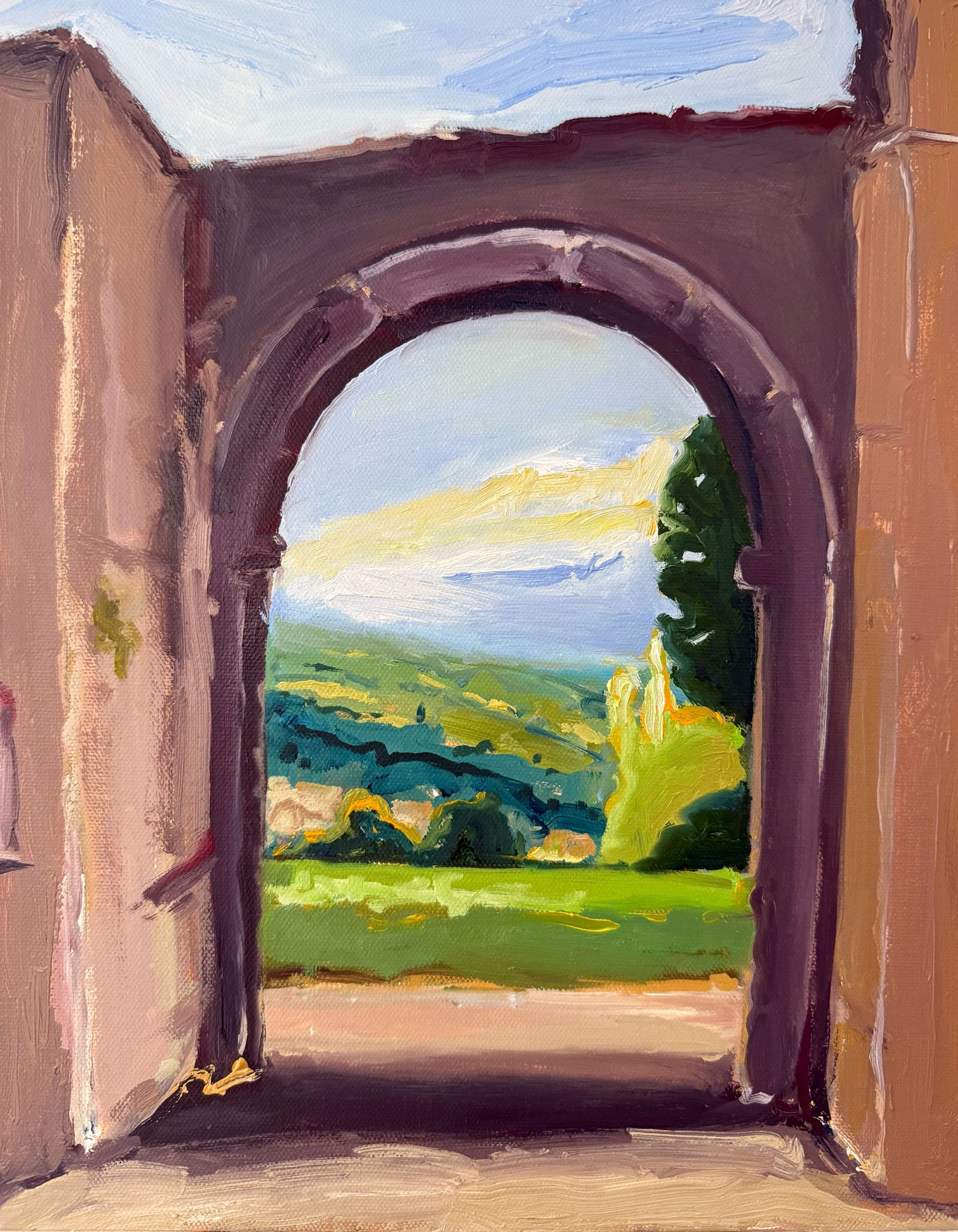 The view captures a breathtaking scene framed by an ancient stone archway in Smerillo, Italy. Through the arch, the viewer is drawn into a layered vista of rolling green hilltops. The light filters gently through the opening, casting subtle shadows and enhancing the depth of the view, inviting contemplation and a quiet sense of wonder.